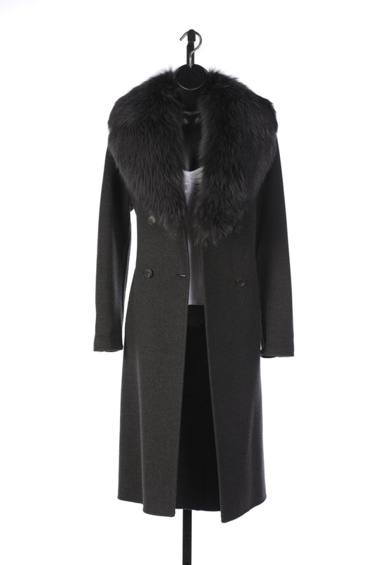 Yves Salomon Wool Grey & Dusty Blue Fox Fur Collar Button Up Full-Length Coat with Belt