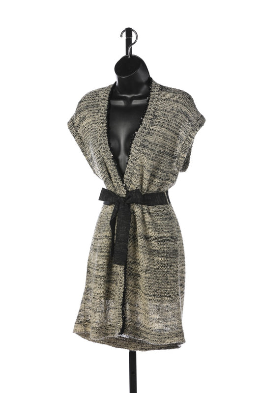 Brunello Cucinelli Grey Black Net Knit Cap Sleeve Button Up Long Cardigan w Waist Tie & Sequin