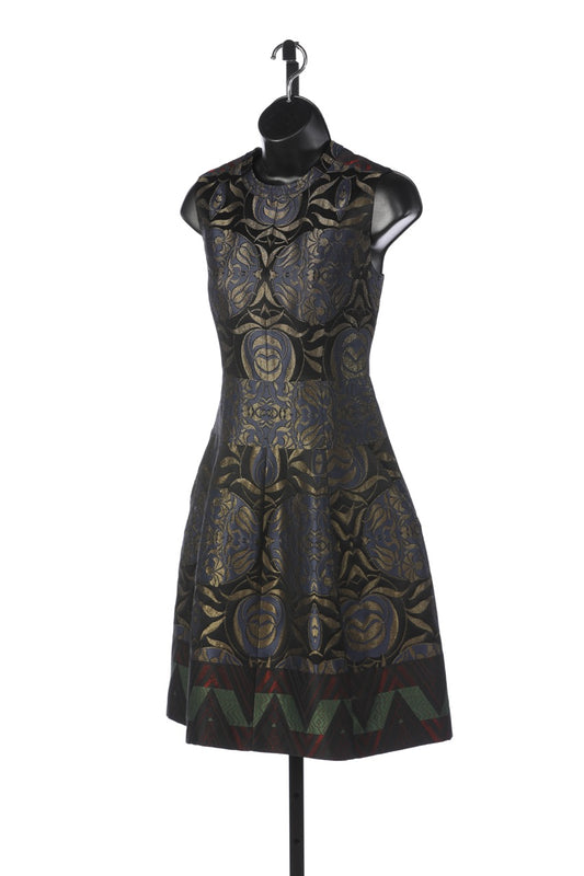 Etro Black w Gold, Blue, & Green Metallic Abstract Print Sleeveless Knee Length Dress