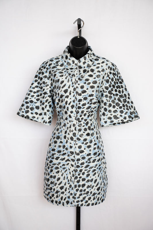 Ganni Light Blue w Black Print Half Sleeve Half Zip Knee-Length Dress