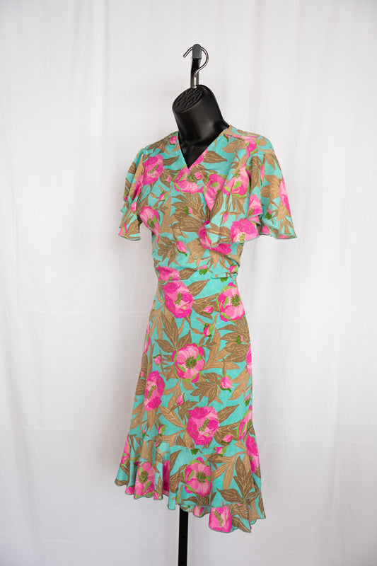 Cienna Silk Turquoise & Pink Short Ruffle Sleeve Tie-Waist Knee-Length Dress
