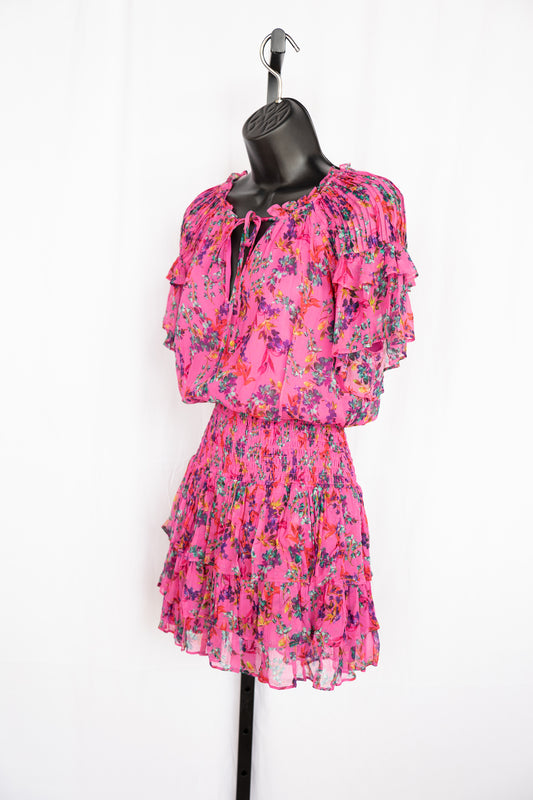 Cinq a Sept Silk Blue & Pink Floral Short Sleeve Chiffon Mini Dress