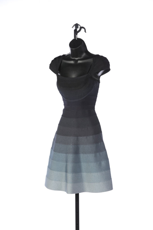 Herve Leger Black & Blue Ombre Cap Sleeve Bandage Knee-Length Dress NWT
