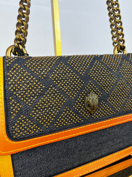 Kurt Geiger Denim & Orange Stud Mini Flap Bag w Crossbody Chain NWT