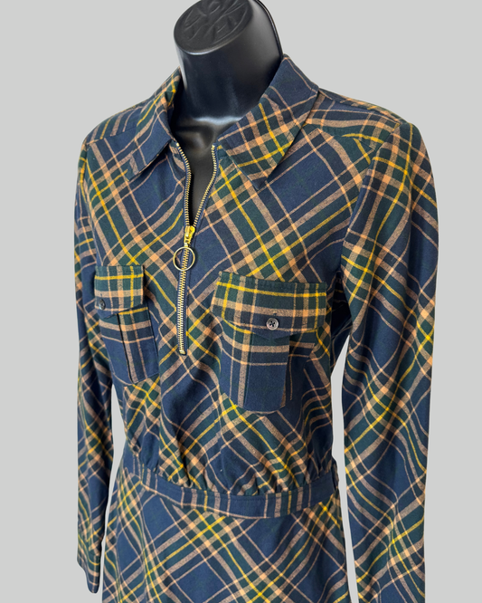 Veronica Beard Navy Orange Plaid 1/2 Zip Long Sleeve Knee-Length Dress NWT