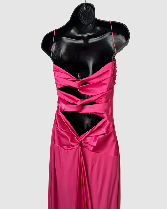 Mary L Couture Satin Hot Pink Sleeveless Ruched Detail Fitted Gown w Ribbon Cutout Back