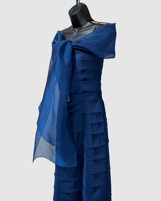 JS Collections Chiffon Dark Blue Sleeveless Tiered Ruffle Crystal Detail Gown w Shawl