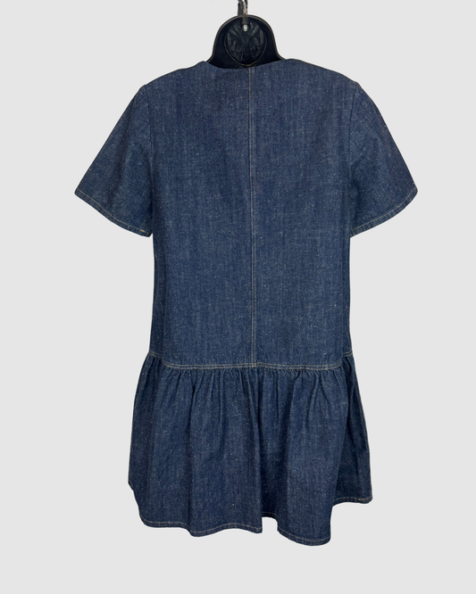 SUNO Dark Denim Short Sleeve Double Breasted 1/2 Zip Ruffle Hem Mini Dress
