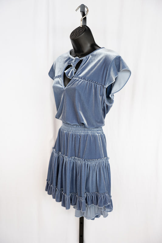 Misa Dusty Blue Velvet V-Neck w Tie Cap Sleeve Smocked Waist Mini Dress w Ruffles