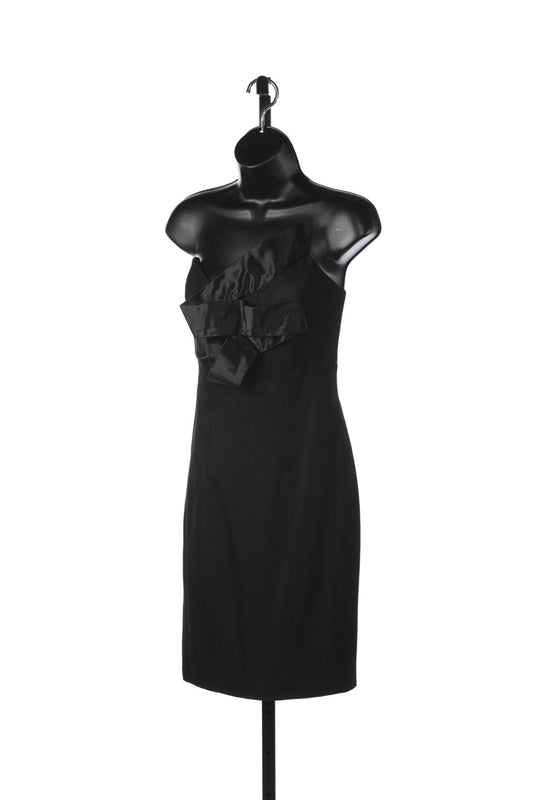 Angel Sanchez Black Strapless Satin Scrambled Bow Tie Detail Mini Dress