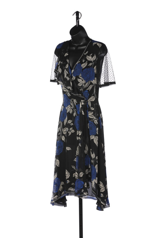 Jason Wu Black w Blue Rose Short Mesh Sleeve Midi Dress w Ruffle Accents