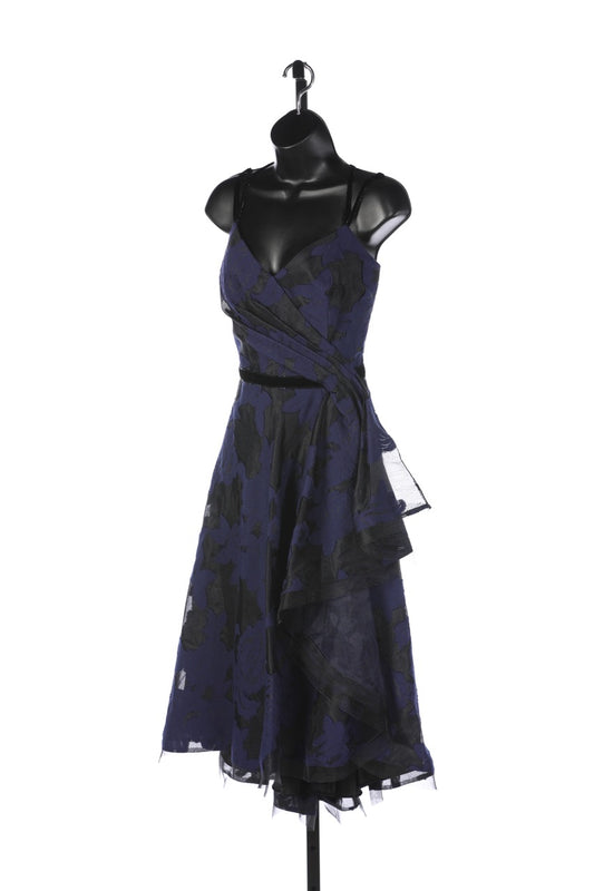 Pamella Roland Navy & Black Floral A-Line V-Neck Flare Skirt Midi Dress