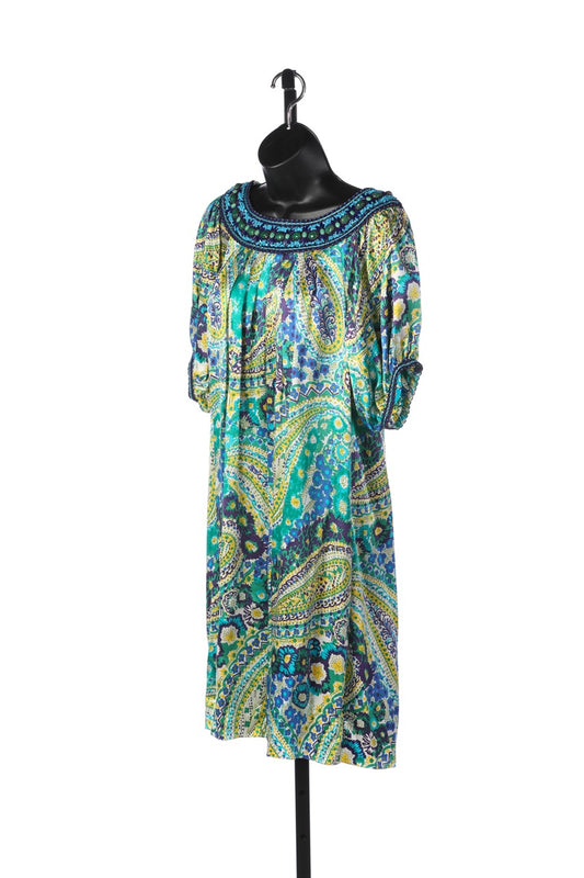 Andrew GN Green Yellow & Blue Silk Paisley Print Short Sleeve Knee-Length Dress