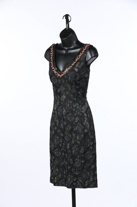 Dolce & Gabbana Black & Gold Floral Pattern Sleeveless Mini Dress w Gold/Red Jewels on Neckline