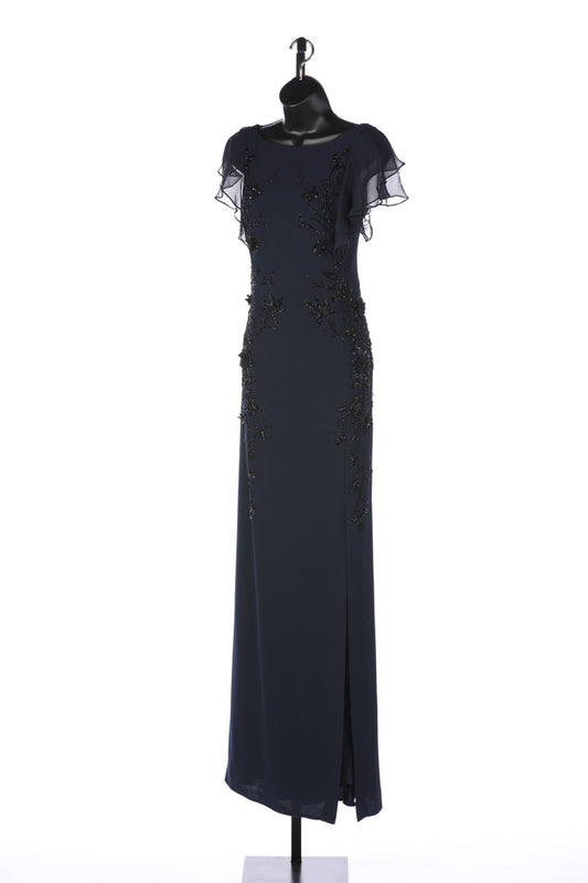 Teri Jon Navy & Black Beaded Cap Chiffon Sleeve Full-Length Dress