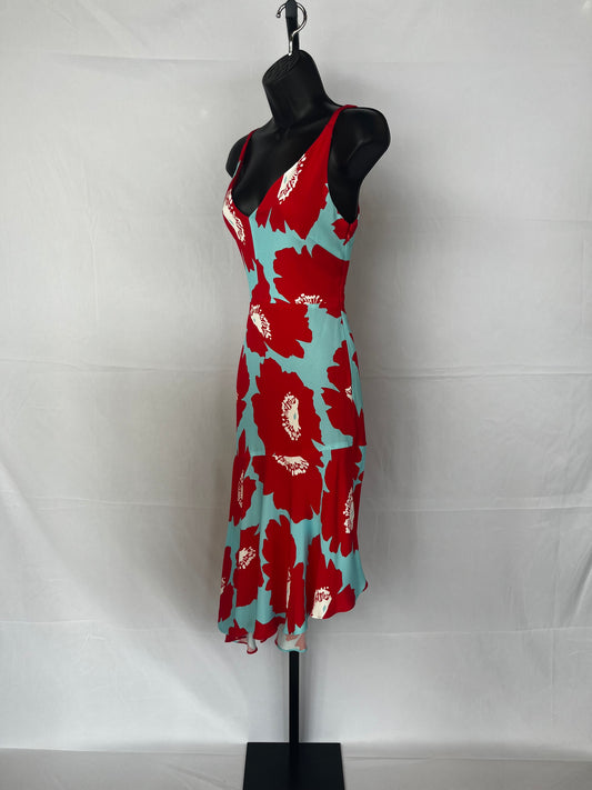 Milly Red & Blue Floral Print Asymmetrical Midi V-Neck Sleeveless Dress NWT