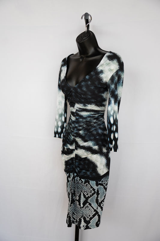 Roberto Cavalli Navy White Ombre Multi Print 3/4 Sleeve Ruched Middle Fitted Midi Dress