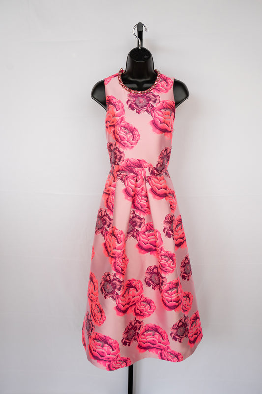 Alice + Olivia Multi Pink Floral High Jeweled Neckline Pleated Midi Dress
