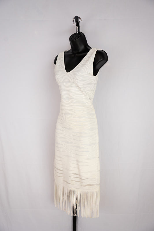 Parker White Stripe Textured Sleeveless Midi Dress w Fringe Hem
