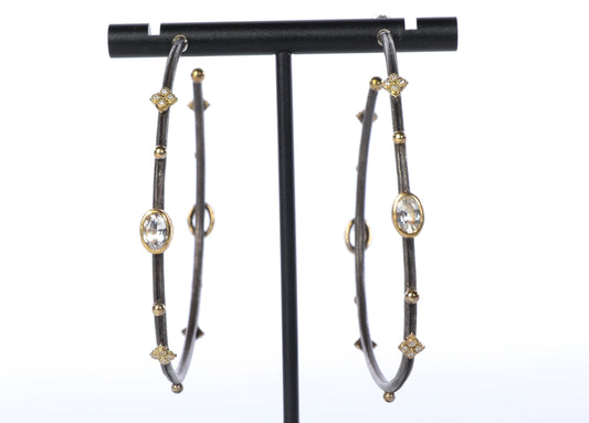 Armenta Oxidized Sterling Silver & 18k Gold Two Tone "Midnight" White Sapphire & Diamond Large Hoop Earrings