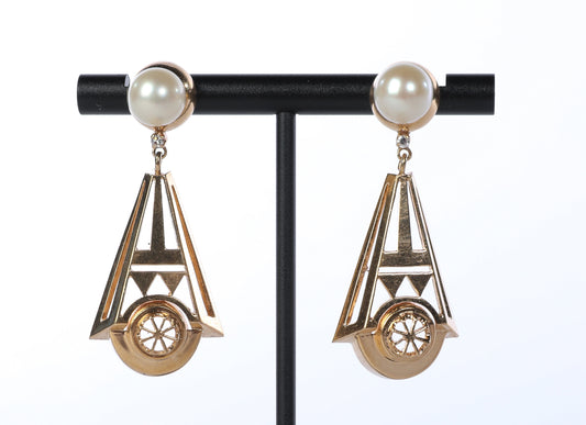 14k Yellow Gold Art Deco 20s Style Dangly Earrings with Pearls and Diamonds