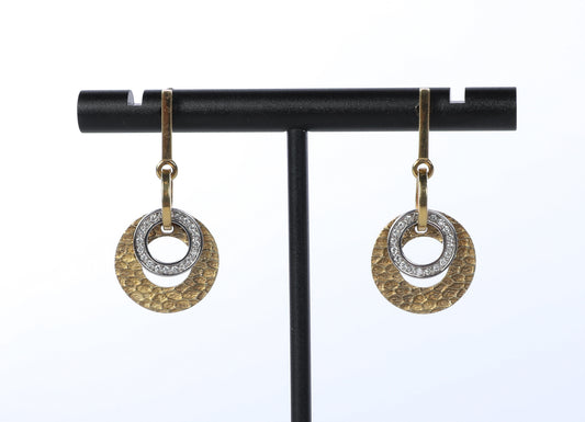14k Yellow Gold & White Gold Two Tone Hammered "Circle of Life" Earrings with Diamonds