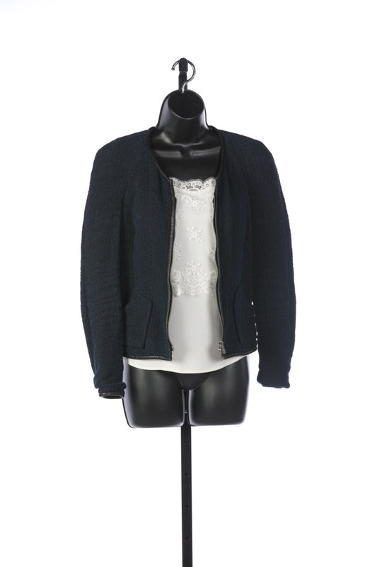 Isabel Marant Dark Blue Boucle Zip Up Jacket w Black Leather Trim