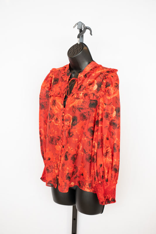 Alice + Olivia Red & Black Floral Button & Tie Neck Long Sleeve Blouse w Ruffle Detail