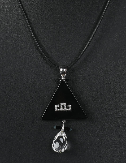 Petrorino Black Onyx Triangle Pendant with Diamonds Set in 18k White Gold w Crystal Drop Charm Necklace