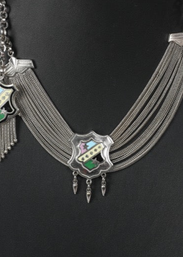 Antique Silver Victorian Enamel Shield Pendant Double Albert Watch Chain Necklace