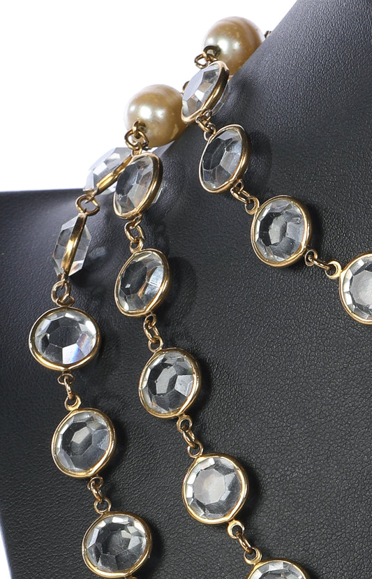 Vintage Chanel 1981 Gold Tone Faux Pearl & Strass Sautoir Single Stand Station Necklace