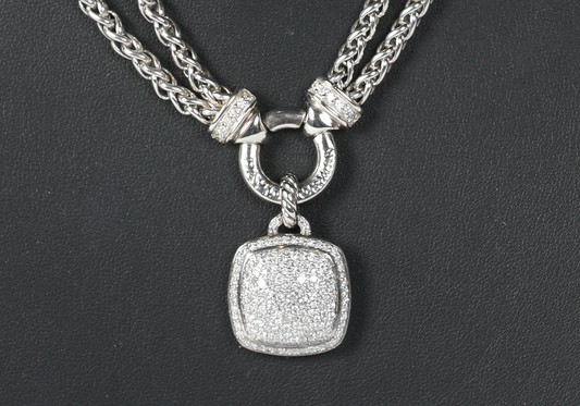 David Yurman Sterling Silver Diamond Pave Albion® Pendant, 17mm on Sterling Silver Double Wheat Chain Necklace with Diamonds, 4mm - 18"