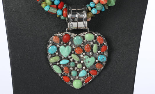 Rocki Gorman Multicolor Turquoise "Many Stone Heart Pendant" on Short Multicolor Turquoise Coral Beaded 4 Strand Necklace