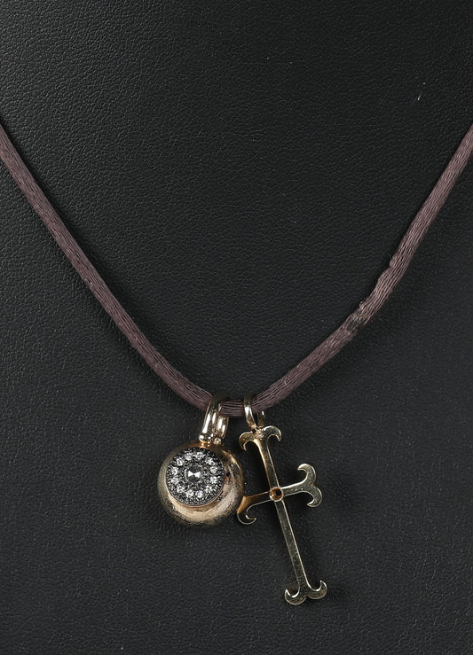 Mizuki 14k Gold Diamond Ball Pendant & Cross Pendant on Brown Cord Necklace
