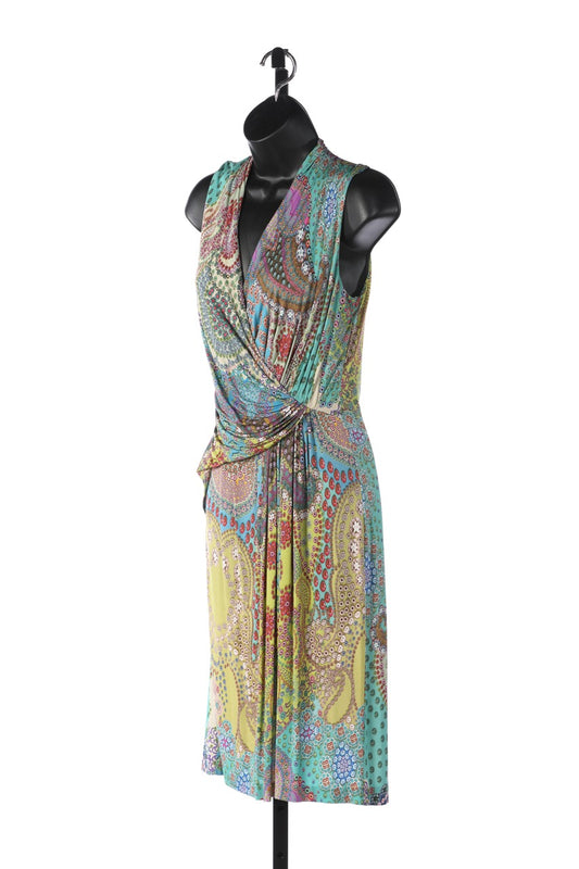 Etro Multi Color Floral/Paisley Sleeveless V-Neck Faux Wrap Knee-Length Dress