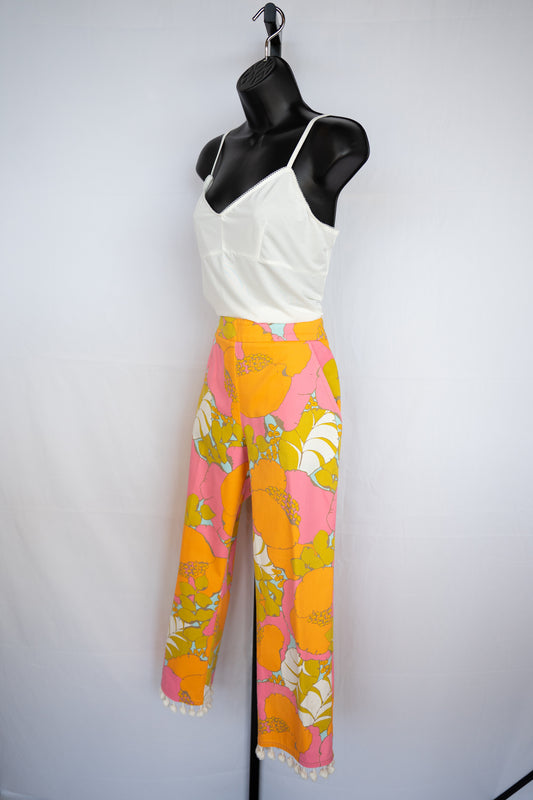 Trina Turk Pink & Orange Floral Pants w/ White Pom Poms on Bottom
