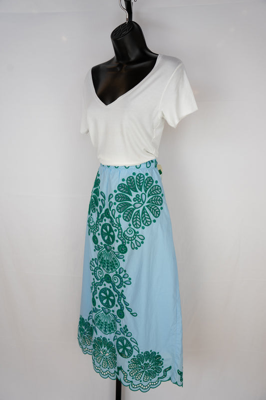 Farm Rio Light Blue w/ Green Embroidery Midi Skirt (HAS MATCHING TOP)
