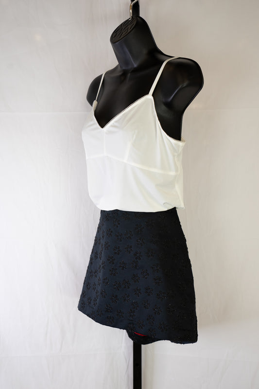 Eduardo Lucero Black Satin Mini Skirt w/ Black Beaded Floral Pattern