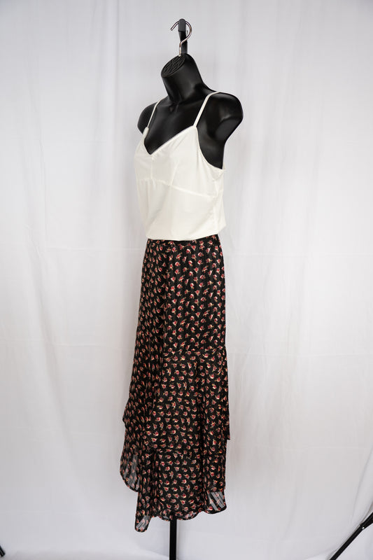 Scotch & Soda Black & Pink Floral Ruffle Hem Midi Skirt