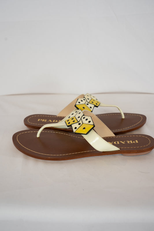 Prada White & Yellow Dice Patent Leather T-strap Sandals