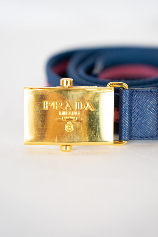 Prada Canvas Blue & Pink Stripe Skinny Belt w Gold Clasp Closure Buckle