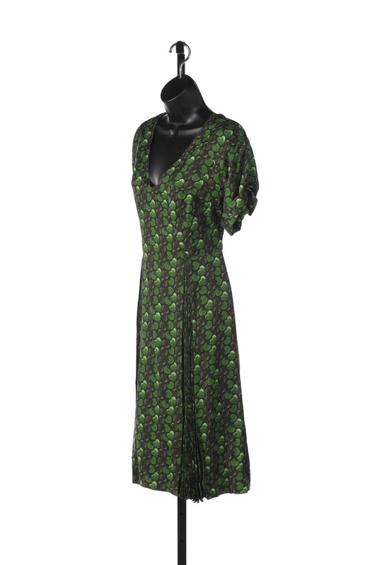 Prada Green Short-sleeve V-Neck Dress w/ Heart-Shaped Print
