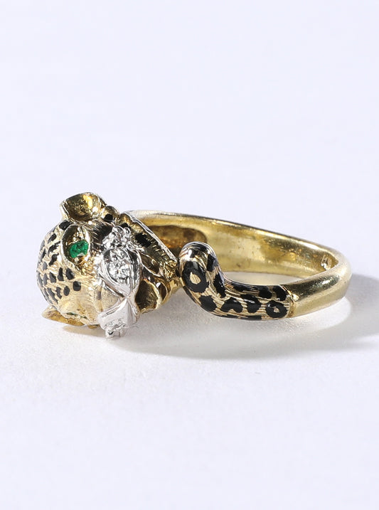 14K Yellow Gold Leopard Head Wrap Rings w Pave Diamond Accents & Emerald Eyes