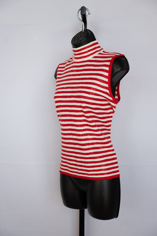 St. John Knit Red & White Stripe & Sequin Sleeveless Mock Neck Top