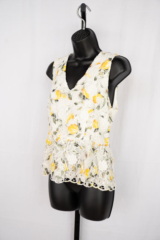 White House Black Market White Crochet Yellow Floral Sleeveless Ruffle Tank