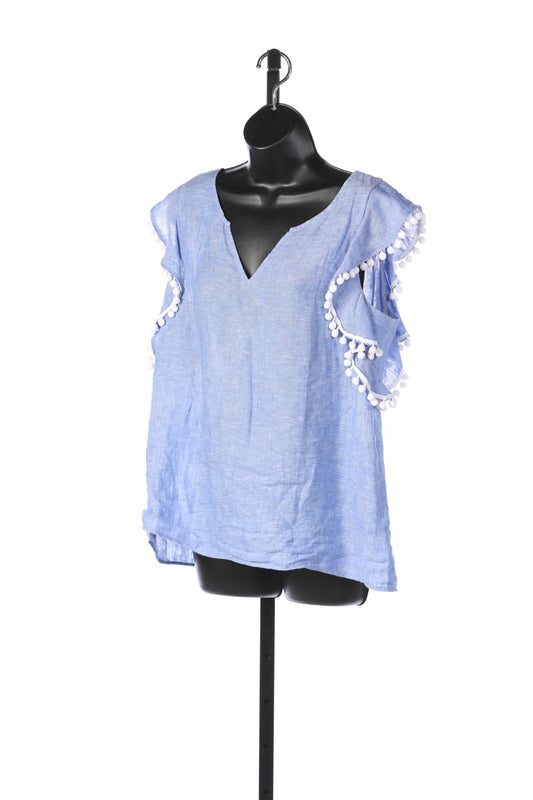 Lilly Pulitzer Linen Purple Cap Ruffle Sleeve Top w White Ball Tassels