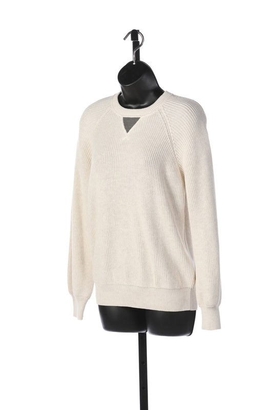 Brunello Cucinelli Oatmeal Long Sleeve Crew-Neck Ribbed Sweater w Triangle Logo Beads on Neck