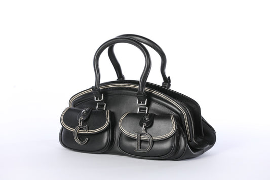 Versace Collection Black Pebbled Leather Vitello Stampa Alce Bowling Bag w Gold Hardware
