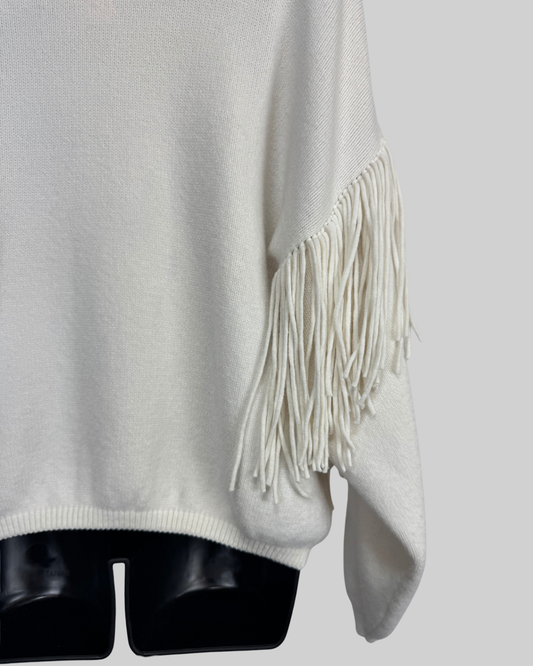 Motel White Knit U-Neck Fringe Detail Long Sleeve Sweater