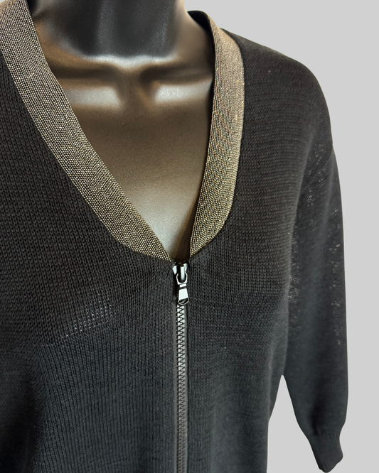 Brunello Cucinelli Black Knit Sig Beading Neck-Line 3/4 Sleeve Zip Up Sweater
